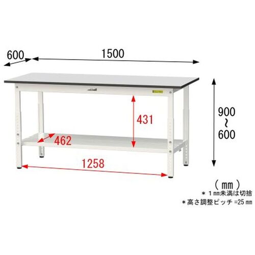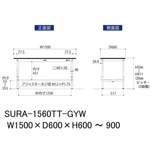 ヤマテック ワークテーブル150シリーズ 高さ調整タイプ 全面棚板付 RoHS2指令対応塩ビシート天板 W1500×D600×H600~H900mm SURA-1560TT-GYW