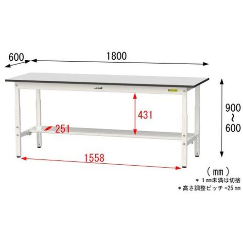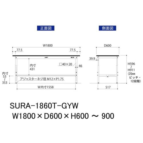 ヤマテック ワークテーブル150シリーズ 高さ調整タイプ 半面棚板付 RoHS2指令対応塩ビシート天板 W1800×D600×H600~H900mm SURA-1860T-GYW