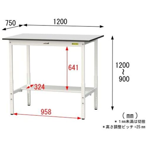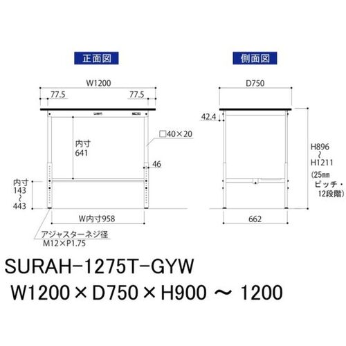 ヤマテック ワークテーブル150シリーズ 高さ調整タイプ 半面棚板付 RoHS2指令対応塩ビシート天板 W1200×D750×H900~H1200mm SURAH-1275T-GYW