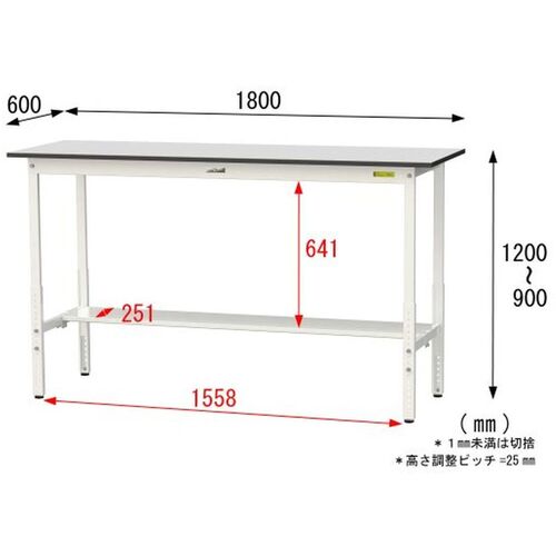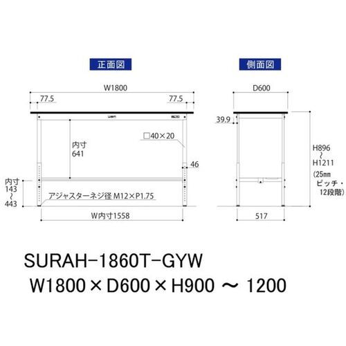 ヤマテック ワークテーブル150シリーズ 高さ調整タイプ 半面棚板付 RoHS2指令対応塩ビシート天板 W1800×D600×H900~H1200mm SURAH-1860T-GYW