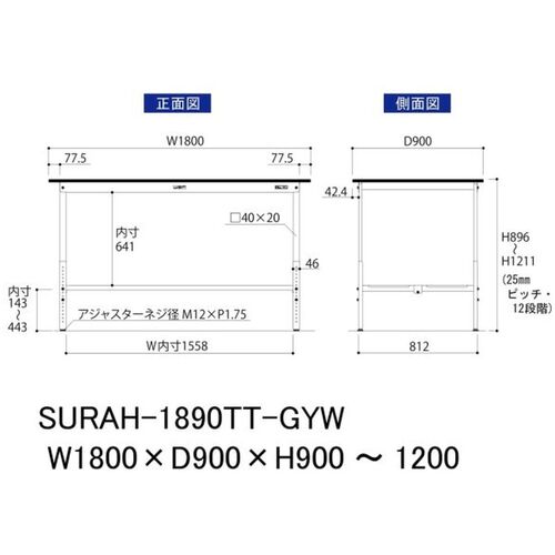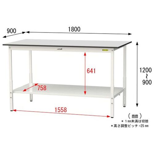 ヤマテック ワークテーブル150シリーズ 高さ調整タイプ 全面棚板付 RoHS2指令対応塩ビシート天板 W1800×D900×H900~H1200mm SURAH-1890TT-GYW