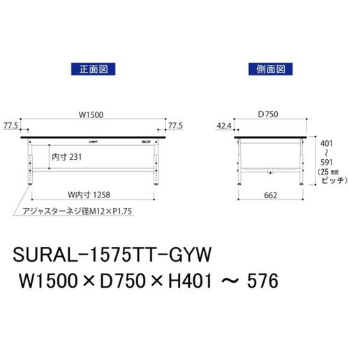 ヤマテック ワークテーブル150シリーズ 高さ調整タイプ低床用 全面棚板付 RoHS2指令対応塩ビシート天板 W1500×D750×H401~H576mm SURAL-1575TT-GYW