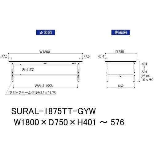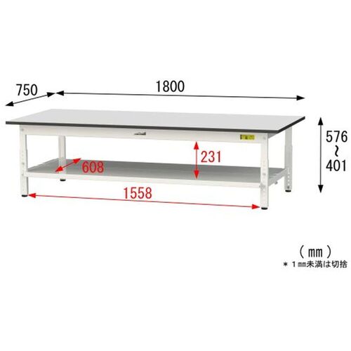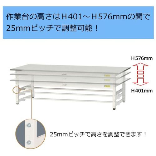 ヤマテック ワークテーブル150シリーズ 高さ調整タイプ低床用 全面棚板付 RoHS2指令対応塩ビシート天板 W1800×D750×H401~H576mm SURAL-1875TT-GYW