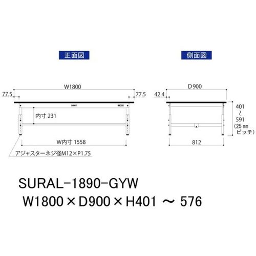 ヤマテック ワークテーブル150シリーズ 高さ調整タイプ低床用 RoHS2指令対応塩ビシート天板 W1800×D900×H401~H576mm SURAL-1890-GYW