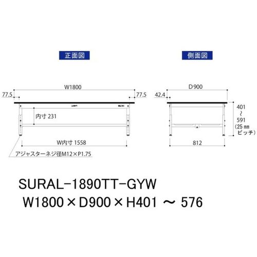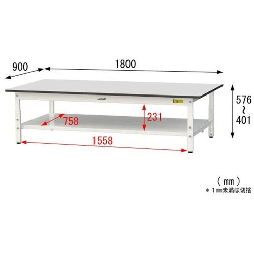 ヤマテック ワークテーブル150シリーズ 高さ調整タイプ低床用 全面棚板付 RoHS2指令対応塩ビシート天板 W1800×D900×H401~H576mm SURAL-1890TT-GYW