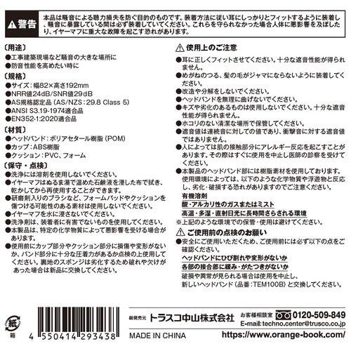 TRUSCO イヤーマフ NRR値24dB TEM100