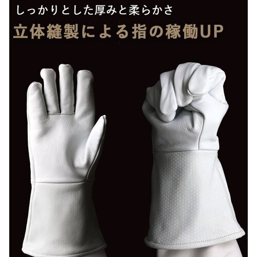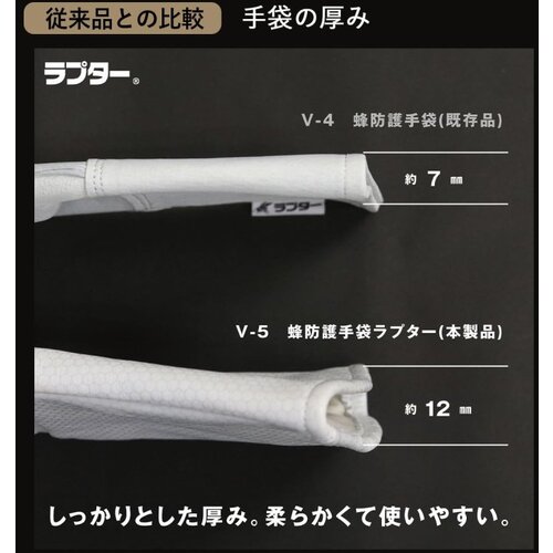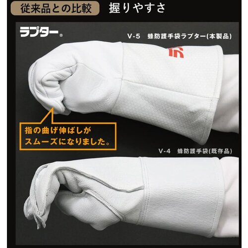 ●V-4から厚み、柔らからさ、立体縫製による指の可動性が向上した新たな蜂防護手袋です。