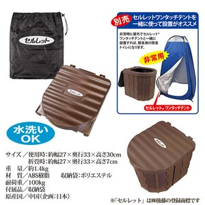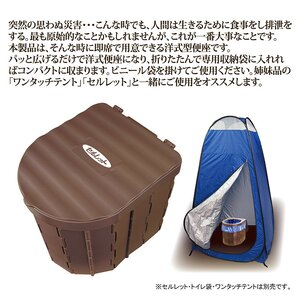 突然の思わぬ災害・・・こんな時でも、人間は生きるために食事をし排泄をする。最も原始的なことかもしれませんが、これが一番大事なことです。本製品は、そんな時に即席で用意できる洋式型便座です。パッと広げるだけで洋式便座になり、折りたたんで専用収納袋に入れればコンパクトに収まります。ビニール袋を掛けてご使用ください。別売りの姉妹品「ワンタッチテント」「セルレット」と一緒にご使用をオススメします。