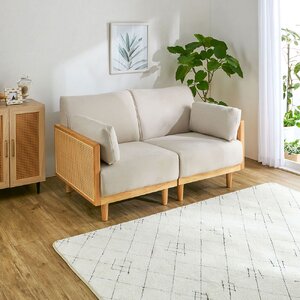 ラタン調ワイドボリュームソファ アイボリーベージュ 組立品