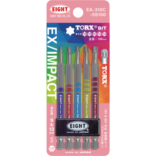 EIGHT トーションビット EX/IMPACT TORXカラービット5本セット 100mm 差込溝9mm&13mm EA-310C-5S10